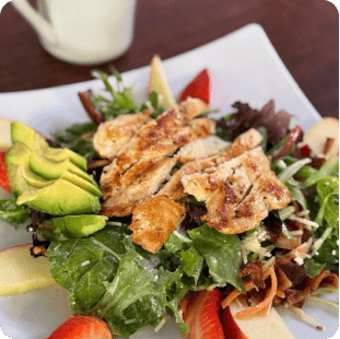 | Burger place | Grilled chicken sandwich + side salad + water |